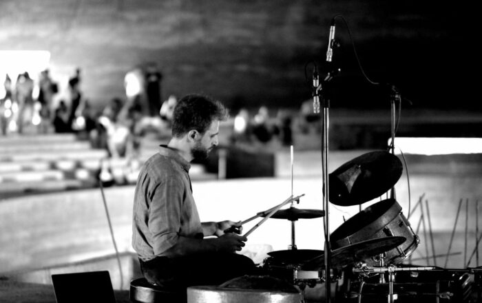 Shakeeb Abu Hamdan (LB) est un musicien et artiste visuel libano-britannique basé à Paris. Dans ses solos, il utilise un set composé d’une batterie, de cloches et de cymbales, qu’il augmente et amplifie avec des transducteurs de surface, des microphones, des effets de modulation, des mégaphones modifiés et d’autres dispositifs électroniques. Ses performances laissent place aux accidents génératifs et à l’improvisation, en réponse aux instabilités du feedback et aux interactions imprévisibles intégrées dans son dispositif instrumental.